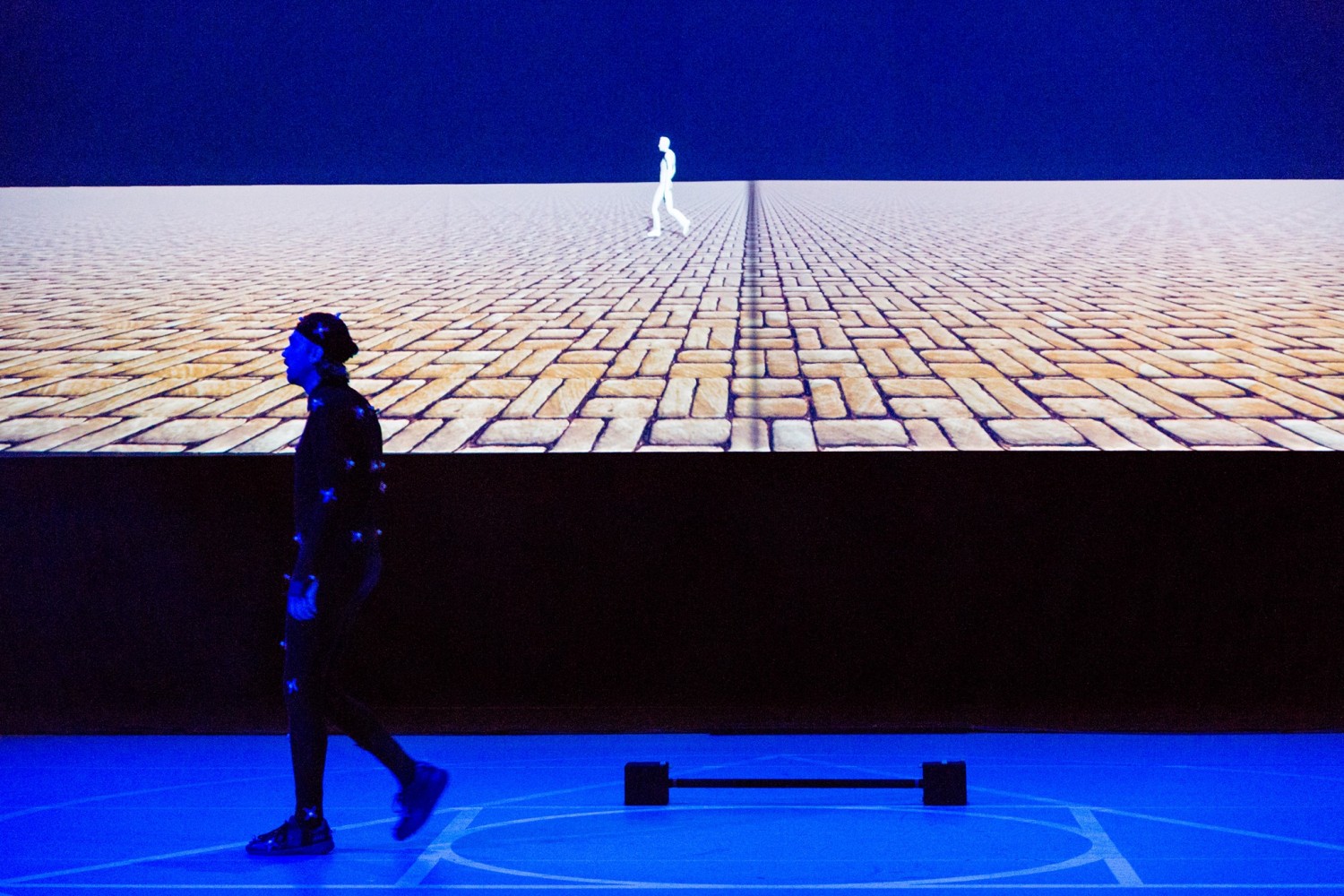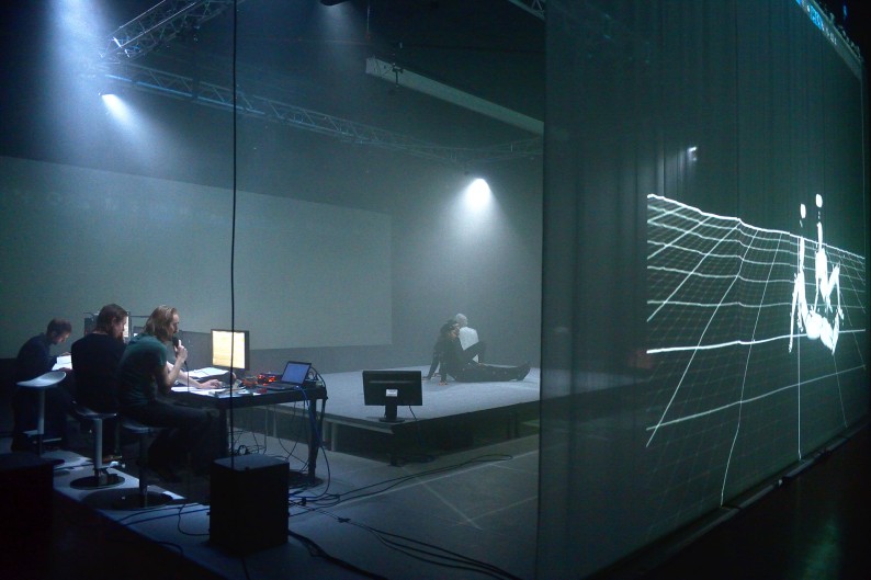 This performance is a joint effort of two generations, Eric Joris/B.C.(Before Computer) and Urland/A.C. (After Computer), exploring new possibilities given by the internet. This was the arguably the first theatrical production to use 3D motion capture in real-time onstage. The live-performance is re-fleshed and transformed in the moment. With recent inertial technology the human bodies of the actors become data and this transformation expands the very idea of the psychical body to new limits. The interest in mediatized artforms and the creation of new ways of experiencing theatre is embedded in the artistic canon of CREW and continues in this challenging collaboration. EXPLORER/Prometheus unchained allows the audience to cross the border between performance space and spectating space. It offers RE-ENACTMENT of the initial promises of 1994 and it provides a glimpse into the future. TUNE IN. TURN ON. BOOT UP. JACK IN. DROP OUT. EXPLORE.