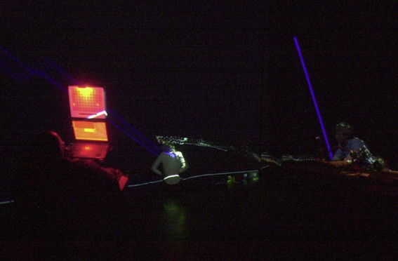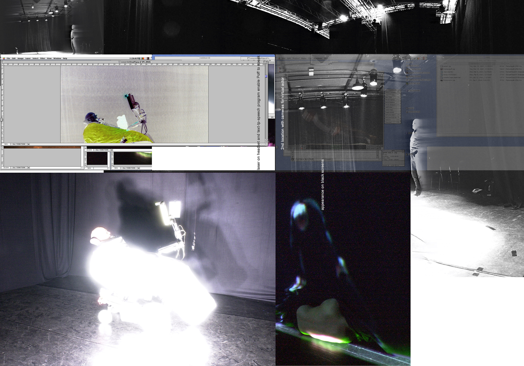 Audience and actor are located in a 8×7×4m computer cave which is completely controlled by the paralyzed actor Paul Antipoff. He speaks, draws, ‘acts’ through a computer interface which he can manipulate by his tongue, his chin and a laser attached on his forehead. A whole network of multimedia is connected to his body as a literal prosthesis. He becomes the modern Icarus who is locked up in the labyrinth of his own body. The audience is surrounded by the turbulent mind of Icarus who prepares his escape by means of electronic wings. Antipoff/_Icarus_ embodies the human desire to surpass our physical limitations.