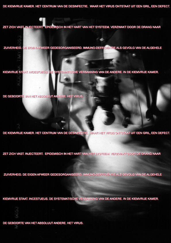DJ Eavesdropper creates a disorienting soundscape and Peter Verhelst provides this performance with a feverish stream of thoughts that penetrates every fiber of your body. In short: a sensory trip that raises the issue of the infiltration and manipulation of the body through technology.