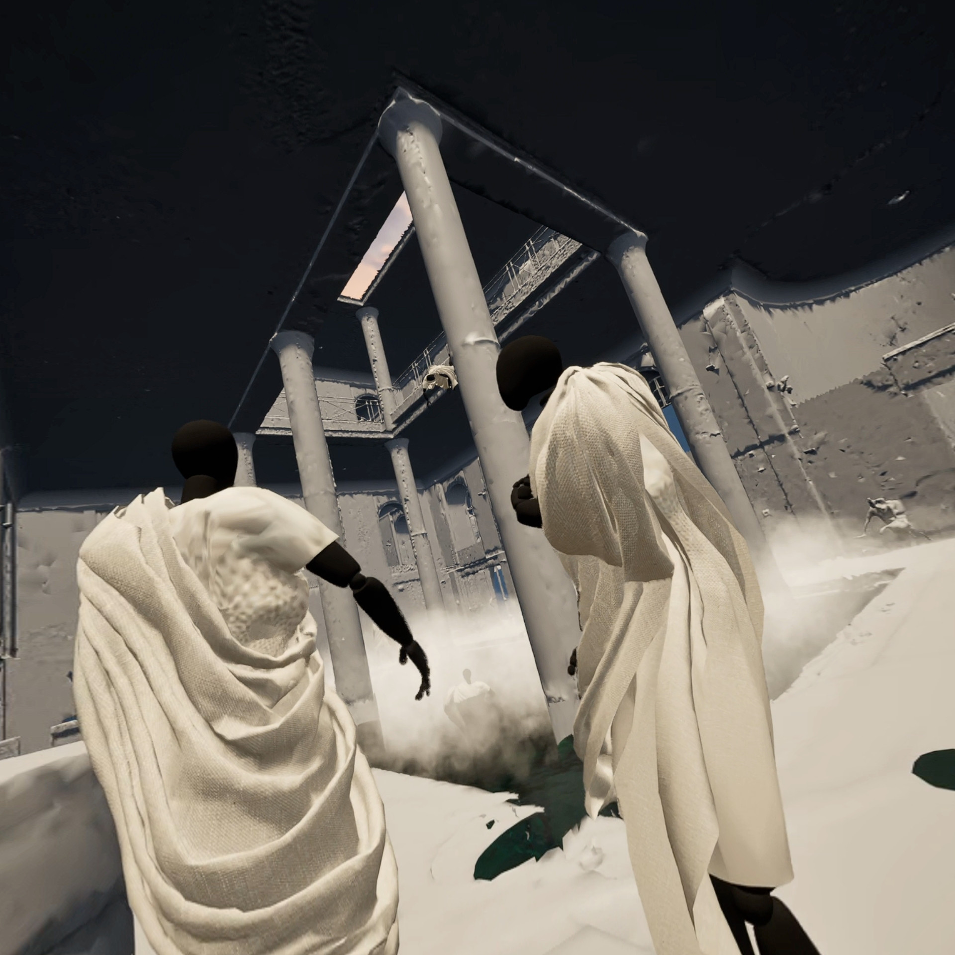 In november 2024 en de zomer van 2025 werd CREW uitgenodigd voor twee residenties om verder te werken aan de immersieve ervaring. Tijdens deze sessies kregen we de gelegenheid om het werk aan het publiek te tonen, waardoor we de productie konden demonstreren en verfijnen op basis van hun feedback. De performer, zichtbaar als avatar, kan zijn eigen lichaam en animaties dupliceren, migreren en opnemen.